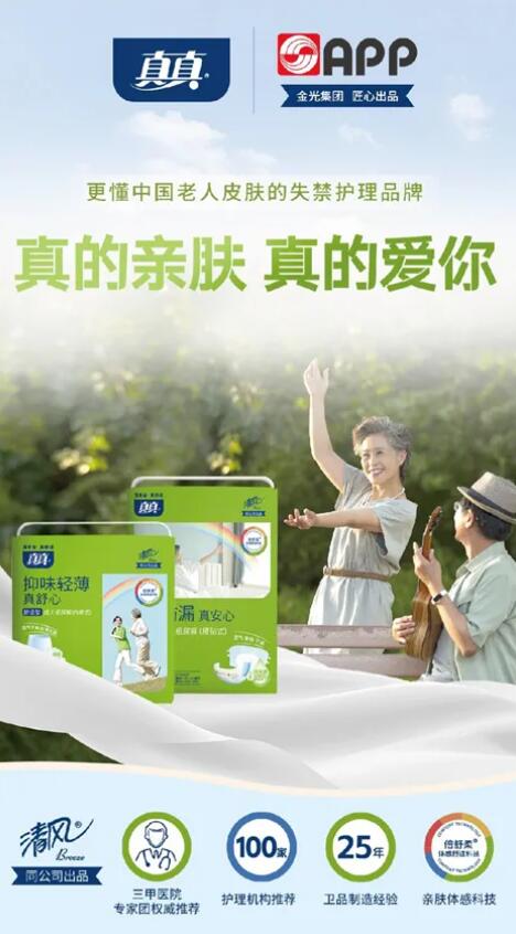 真真,更懂中國老人皮膚的失禁護理品牌。集結集團25年衛生用品制造經驗,三甲醫院專業醫生護士團,專研老人脆弱肌,匠心打造五維“親膚護理級”產品,解決失禁問題的同時,更細致照護中國老人脆弱的肌膚。 真真親膚型成人拉拉褲,深入挖掘用戶的核心需求,解決了具有中輕度活力老人的痛點,讓他們重新開啟精彩的退休生活,讓人生下半年依然能發光發熱,樂享無憂。