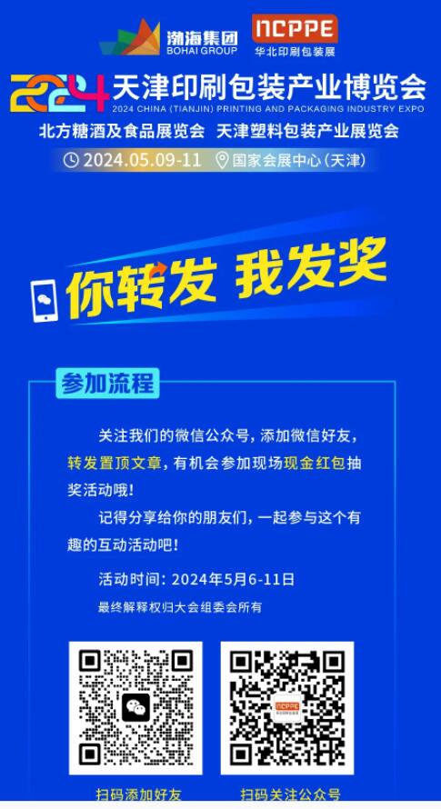 中國(天津)印刷包裝產(chǎn)業(yè)博覽會 2024年5月09日-11日 國家會展中心(天津) 期待您的加入! 2024中國(天津)印刷包裝產(chǎn)業(yè)博覽會(簡稱:NCPPE華北包裝展)將于2024年5月9-11日,國家會展中心(天津)盛大召開!同期舉辦:天津印刷包裝展、天津塑料產(chǎn)業(yè)展、天津金屬包裝展、北方糖酒及食品展,四展聯(lián)動、設(shè)立4000個標準展位、預(yù)計1000家企業(yè)集中亮相。 展會由天津市包裝技術(shù)協(xié)會主辦,渤海集團(天津)國際展覽有限公司承辦。我們將圍繞工業(yè)4.0與打造展示,體驗,交流,交易四個平臺,集中展示印刷包裝行業(yè)新材料,新設(shè)備,新技術(shù),新工藝,新產(chǎn)品,打造專業(yè)觀眾開闊思路,社會觀眾增強的體驗平臺。融印刷原理學(xué)習(xí),印刷流程參與,印刷包裝產(chǎn)品制作為一體;打造發(fā)展動態(tài),推動深化改革的交流平臺,打通政產(chǎn)研學(xué)通道,為印刷包裝企業(yè)提供創(chuàng)新發(fā)展的新理念,新思路,新模式,新樣板,解決行業(yè)發(fā)展痛點,打造供需對接,宣傳賣買交易平臺,為包裝印刷產(chǎn)品找市場,為印刷包裝市場推介優(yōu)秀產(chǎn)品和服務(wù)。 本屆展會以“紙包裝、塑料包裝、金屬包裝、糖酒食品”四大領(lǐng)域為主題,構(gòu)建包裝全產(chǎn)業(yè)鏈。必將是一次高層次、大規(guī)模、影響深遠隆重的盛會。在此我們誠摯邀請國內(nèi)外包裝印刷行業(yè)仁人志士,參與2024華北印刷包裝展的建設(shè)。我們將以飽滿熱情和周到的服務(wù)迎接您的到來!
