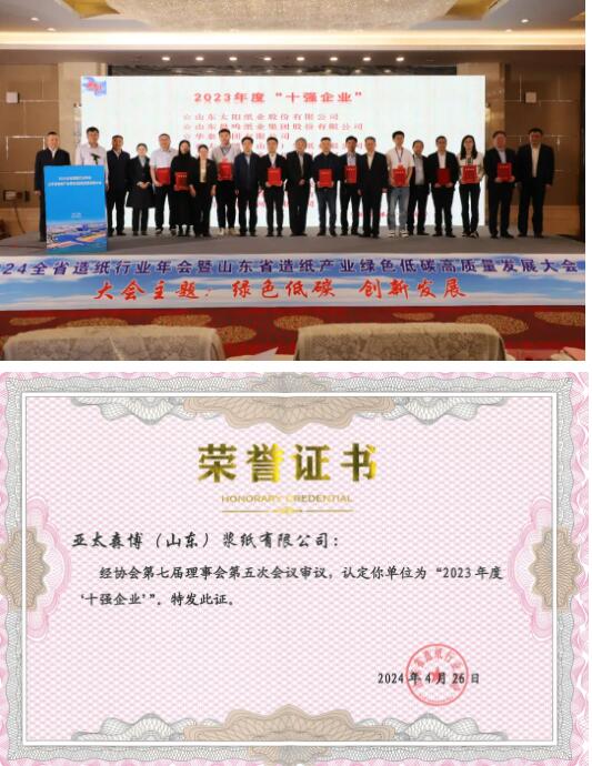 2024年4月25~26日,亞太森博(山東)漿紙有限公司聯合山東省造紙行業協會、山東造紙學會主辦的以“綠色低碳、創新發展”為主題的2024山東省造紙行業年會暨山東省造紙產業綠色低碳高質量發展大會成功召開。