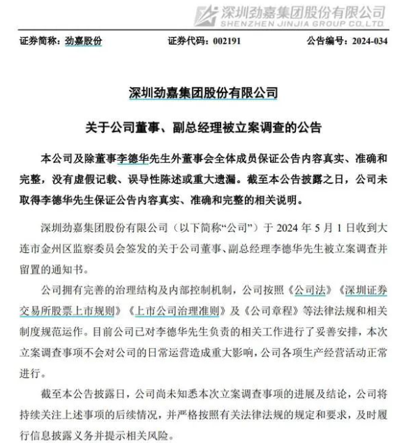 勁嘉股份5日公告,公司于2024年5月1日收到大連市金州區監察委員會簽發的關于公司董事、副總經理李德華被立案調查并留置的通知書。