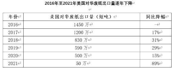 美國ResourceRecycling近日發布了一份報告,分析了近年來美國再生漿出口的現狀和趨勢,為業界人士了解美國再生紙出口狀況提供了一個參考視角。 受2018年禁廢政策沖擊波影響,美對華廢紙出口量斷崖式下降 2017年以來,隨著中國政府不斷收緊對廢紙進口的限制,美國對華廢紙出口量呈斷崖式下降趨勢。2016年,美國對華廢紙出口量為1450萬短噸,此后逐年下降(見下表),至2021年僅剩50萬短噸,同比降幅高達89%。這意味著,到2021年,美國對華廢紙出口量比五年前下降了96%。