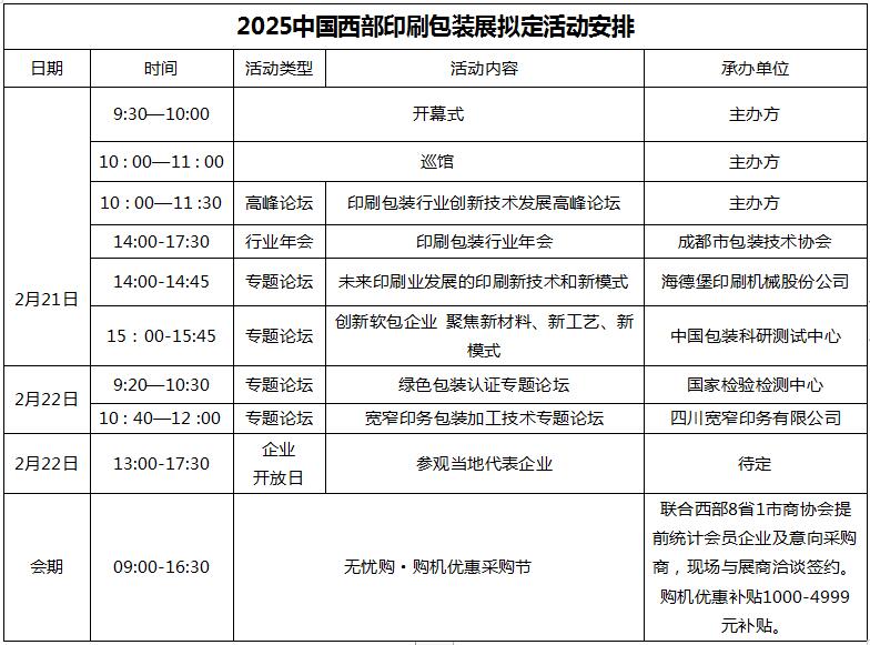二、大會亮點 展出高度:新產品、新技術集中亮相。整體布局從供應端到成品端,展現行業新水平。 論出水平:十余場專題論壇及采購對接大會,匯聚官產財學研,啟迪思維、達成交易。 關注實效:西部城市戰略定位,激發千億市場采購需求。 全面涵蓋:印前加工、印刷包裝、印刷設備、瓦楞設備等1400余品牌架構全產業鏈。 對接資源:聯合8省1市行業商協會,與采購商“一對一”精準對接。 三、展會介紹 2025中國西部(成都)國際印刷包裝全產業博覽會(簡稱:WPPE西部印刷包裝展)順應國家趨勢,將于2025年2月21-23日在中國西部國際博覽城舉辦。大會將圍繞工業4.0與打造展示、體驗、交流、交易四個平臺,推出保專業、保效果、保成交、保物流、保金融5保為一體的會展新服務,確保參展效果。集中展示印刷包裝行業新材料、新設備、新技術、新工藝、新產品,開闊專業觀眾思路,增強社會觀眾體驗的專業平臺。博覽會展覽規模預計30000平米,展商500家,專業觀眾25000人,展覽期間還將舉辦印刷包裝行業發展峰會、專題論壇、采購對接會、新品發布會、行業年會等活動。 四、強勢宣傳 (1)充分利用專業展覽公司多年來積累的生態環境領域觀眾數據庫,針對性地向目標專業觀眾和行業用戶發布最新展商及展品信息,邀請專業觀眾前來參觀。 (2)與政府相關部門/行業學會/協會/商會等行業組織強強聯合,通過行業組織發函邀請其會員單位組團參觀。 (3)行業媒體:中國包裝網、中國印包網、中國紙網、中紙在線、中華印刷包裝網、中外印機網、中紙網、紙箱網、大中華印藝網、印刷界、包裝印刷產業網等超100家專業媒體。 (4)線下宣傳:高鐵站、地鐵站、高速路牌、車身廣告、產業園區等線下產業園區廣告全覆蓋。 (5)利用短信,互聯網(抖音、快手、微信)媒體等多種渠道鋪天蓋地式宣傳。 (6)與重點媒體達成戰略合作,除大量的廣告宣傳之外,加強利用合作媒體的高質量行業數據庫,進行買家和行業用戶定期直郵服務。 主辦方將通過權威媒體、自媒體、各大行業媒體等100+家,打造360度*24小時的持續宣傳圈,全方位保障參展成效! 五、展示內容 印前加工(系統-器材-軟件):設計與排版、數據庫出版與數據通訊、PDF出版、網絡出版、自動化印刷模板生產、CTP/CTF、工作流程系統、JDF/MIS; 印刷包裝:煙包酒包設備、紙印刷設備、無紡布印刷設備、印前設備、印后及包裝加工設備、印品質量檢測、裝飾技術、印刷機裝配技術、標簽及包裝材料、綠色包裝材料與制品、基礎設備等; 印后設備:模切機、糊盒機、制袋機、裱紙機、壓痕機、開槽機、切角機、釘箱機、捆扎機、堆碼機、覆膜機、上光、燙壓、分切、縱切、裝訂設備等; 瓦楞紙箱:瓦楞紙板生產線、單面瓦楞紙板生產、單面瓦楞機、雙面瓦楞機、薄刀縱切壓痕機、橫切機、堆碼機、接紙機、制糊系統、預熱缸、原紙架、瓦楞輥、瓦楞紙板輸送帶等; 精品酒包:包裝設計、玻璃/陶瓷酒瓶、高檔酒具、高檔酒盒、瓶蓋、印刷工藝、防偽技術、標牌生產、展示柜、印刷設備、釀酒設備、精包裝機械 標簽印刷:標簽印刷設備、智能標簽、條碼、防偽印刷設備、噴墨印刷系統、模內標簽材料及貼標設備、標簽防偽技術、安全方案及應用、條形碼、不干膠等標簽印刷材料及相關耗材配件。 包材容器:紙包裝容器、塑料包裝容器、金屬包裝容器、玻璃包裝容器、包裝材料及配件、包裝服務、智能包裝及相關材料配件、其他材料包裝容器等; 服務和其他:紙張、承印物、油墨和耗材、配套和基礎設施、服務和軟件業等。 六、觀眾來源 各省市印刷包裝企業:大型印刷企業、紙箱紙板生產企業、彩盒印刷企業、紙箱廠、紙漿模塑廠、紙管廠、商業印刷、標簽印刷、復印出版、航空航天、塑料制造、兒童車玩具、日化包裝等; 相關行業:食品飲料、藥品化妝品生產企業、汽車行業、電子產品、全國包裝產品生產企業、印刷品生產企業、經銷商、代理商等; 產品設計機構:品牌設計與運營商、廣告公司、出版商、圖文檔案和圖像數據庫、數據處理服務、印刷服務供應商、印版生產商、印刷業電子商務、金融服務及保險服務提供商、二手機經銷商、印刷機的運輸和安裝、軟件、行業協會和專業組織等; 服務業:酒店、大賣場、大商場、行業商協會、媒體、政府單位機構等。 七、行業聲音 成都市包裝技術協會會長周仕林 我國西部印刷包裝市場前景廣闊,具有巨大的發展潛力。隨著經濟的發展和消費升級,印刷包裝行業的需求不斷增長,西部印刷包裝產業也在不斷創新和發展,技術水平和服務質量顯著提升,為市場提供了更多優質的產品和服務。 上海鼎龍機械有限公司企業表示,此次展會的展示內容非常豐富和前沿,涵蓋了印刷包裝行業的最新技術、設備和材料。不僅是了解行業最新動態的機會,還推動了西南市場的開發效率。明年還將積極參與,同時擴大展覽面積,繼續加強與行業同仁的交流和合作。 上海嘉億機械有限公司表示,西部印刷包裝展的召開,為我們公司提供了一個很好的與西南區域客戶溝通交流的平臺,此次大會,意向客戶較多,未來將帶更多產品進行展示。 八、同期活動