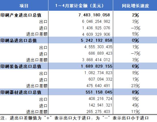 根據(jù)國家海關(guān)總署最新發(fā)布的統(tǒng)計數(shù)據(jù),2024年1~4月國內(nèi)印刷品、印刷裝備、印刷器材進出口總值為74.83億美元(參見表1),與去年同期相比增長2%。其中,出口60.46億美元(同比增長3%)、進口14.37億美元(同比下降3%)。三大類商品進出口貿(mào)易順差合計46.09億美元(同比增長5%)。 表12024年1~4月國內(nèi)印刷產(chǎn)業(yè)進出口總值表
