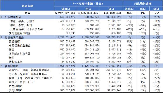 本期,國內(nèi)印刷產(chǎn)業(yè)進出口呈現(xiàn)如下特征: (1)從規(guī)模總量增長態(tài)勢看,產(chǎn)業(yè)進出口運行平穩(wěn)、并保持同比增長 1~4月,國內(nèi)印刷產(chǎn)業(yè)進出口同比增長2%,與上期增幅持平。最近幾年,國內(nèi)印刷產(chǎn)業(yè)進出口各年同期的同比增速表現(xiàn)出從大起大落到逐漸回穩(wěn)的態(tài)勢。從-30%(2020年)、12%(2021年)、8%(2022年)、0%(2023年)到2%(2024年),國內(nèi)印刷產(chǎn)業(yè)進出口已經(jīng)步入平穩(wěn)運行的軌道。 (2)從商品出口和進口結(jié)構(gòu)動態(tài)看,出口和進口占比結(jié)構(gòu)相對穩(wěn)定。出口商品中,印刷品、印刷裝備、印刷器材同步增長;而進口商品中,印刷品繼續(xù)下行、印刷裝備由降轉(zhuǎn)增、印刷器材保持增長 1~4月國內(nèi)印刷產(chǎn)業(yè)出口同比增長3%、進口則同比下降3%。產(chǎn)業(yè)進出口占比中,出口81%、進口19%。與去年同期相比,出口占比提升了1個百分點、進口占比下降了一個百分點。 同期,出口商品中,印刷品、印刷裝備、印刷器材出口均處于同比增長狀態(tài),其同比增長速度分別為1%、9%、9%。而相對應(yīng)的進口商品,印刷品同比下降7%、印刷裝備同比增長1%、印刷器材同比增長4%。 (3)從全球區(qū)域市場的貿(mào)易分布看,國內(nèi)印刷產(chǎn)業(yè)與亞洲、北美、拉美和非洲市場市場的進出口保持增長,與歐洲、大洋洲市場進出口出現(xiàn)下降 1~4月,國內(nèi)印刷產(chǎn)業(yè)與亞洲市場進出口34.63億美元(同比增長6%)、與歐洲市場進出口15.68億美元(同比下降6%)、與北美洲市場進出口15.25億美元(同比增長1%)、與拉丁美洲市場進出口3.96億美元(同比增長26%)、與非洲市場進出口2.73億美元(同比增長5%)、與大洋洲市場進出口2.58億美元(同比下降20%)。同期,國內(nèi)印刷產(chǎn)業(yè)進出口在全球各區(qū)域市場的分布為亞洲46%、歐洲21%、北美洲20%、拉美5%、非洲4%、大洋洲3%。 另外,1~4月國內(nèi)印刷產(chǎn)業(yè)與東盟進出口14.22億美元(同比增長21%)、與歐盟進出口11.38億美元(同比下降3%)、與中東地區(qū)進出口5.20億美元(同比增長13%)。 (4)從主要貿(mào)易伙伴進出口貿(mào)易額及變化情況看,國內(nèi)印刷產(chǎn)業(yè)與美國進出口呈現(xiàn)停滯,與日本、德國、英國、澳大利亞等發(fā)達經(jīng)濟體市場進出口同比下滑,與越南、墨西哥市場進出口同比大幅增長 1~4月,居國內(nèi)印刷產(chǎn)業(yè)進出口前列的貿(mào)易伙伴進出口情況: ·美國:進出口14.14億美元(同比持平)。其中,出口11.34億美元(同比下降1%),進口2.81億美元(同比增長5%); ·日本:進出口5.80億美元(同比下降2%)。其中,出口2.11億美元(同比下降15%)、進口3.69億美元(同比增長7%); ·德國:進出口3.35億美元(同比下降12%)。其中,出口1.37億美元(同比增長7%),進口1.98億美元(同比下降22%); ·英國:進出口2.44億美元(同比下降5%)。其中,出口1.99億美元(同比下降4%)、進口4463.58萬美元(同比下降10%); ·澳大利亞:進出口2.24億美元(同比下降24%)。其中,出口2.19億美元(同比下降25%),進口536.76萬美元(同比增長20%); 同期,國內(nèi)印刷產(chǎn)業(yè)與全球產(chǎn)業(yè)供應(yīng)鏈調(diào)整熱點國家進出口情況: ·越南:進出口3.48億美元(同比增長33%)。其中,出口3.42億美元(同比增長33%),進口654.73萬美元(同比增長24%); ·印度:進出口1.86億美元(同比增長1%)。其中,出口1.84億美元(同比增長2%),進口204.62萬美元(同比下降21%); ·墨西哥:進出口1.45億美元(同比增長22%)。其中,出口1.15億美元(同比增長18%),進口3001.90萬美元(同比增長37%); 國內(nèi)印刷品出口和進口基本情況 2024年1~4月國內(nèi)印刷品出口45.55億美元(參見表2),同比增長1%。其中,出版物印刷品出口5.09億美元(同比下降2%)、包裝裝潢印刷品出口26.20億美元(同比增長3%)、商務(wù)印刷品出口14.26億美元(同比下降1%)。 表22024年1~4月國內(nèi)印刷品進出口總值表