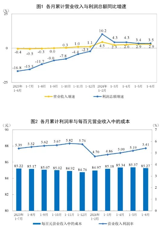 1—6月份,規模以上工業企業實現營業收入64.86萬億元,同比增長2.9%;發生營業成本55.31萬億元,增長2.9%;營業收入利潤率為5.41%,同比提高0.03個百分點。其中,造紙和紙制品業實現營業收入6992.1億元,同比增長6.0%;印刷和記錄媒介復制業實現營業收入3118.2億元,同比增長3.5%。 6月末,規模以上工業企業資產總計172.05萬億元,同比增長5.7%;負債合計99.07萬億元,增長5.4%;所有者權益合計72.97萬億元,增長6.0%;資產負債率為57.6%,同比下降0.1個百分點。 6月末,規模以上工業企業應收賬款24.75萬億元,同比增長8.6%;產成品存貨6.37萬億元,增長4.7%。 1—6月份,規模以上工業企業每百元營業收入中的成本為85.27元,同比增加0.02元;每百元營業收入中的費用為8.43元,同比增加0.05元。 6月末,規模以上工業企業每百元資產實現的營業收入為76.3元,同比減少2.4元;人均營業收入為178.8萬元,同比增加7.5萬元;產成品存貨周轉天數為20.3天,同比增加0.2天;應收賬款平均回收期為66.2天,同比增加3.5天。 6月份,規模以上工業企業實現利潤同比增長3.6%。 國家統計局工業司統計師于衛寧解讀工業企業利潤數據表示,上半年,隨著各項宏觀政策落實落細,工業生產平穩較快增長,企業利潤持續穩定恢復,工業企業效益狀況呈現以下主要特點:工業企業利潤增速有所加快。工業企業營收穩定恢復。裝備制造業有力支撐工業利潤增長。消費品制造業利潤持續快速增長。采礦業、原材料制造業利潤降幅明顯收窄。企業當月單位成本繼續同比減少。總體看,上半年規上工業企業效益平穩恢復,同時也要看到,國內有效需求不足制約企業效益持續改善,國際環境嚴峻復雜加大企業經營壓力,工業企業效益恢復基礎仍需鞏固。