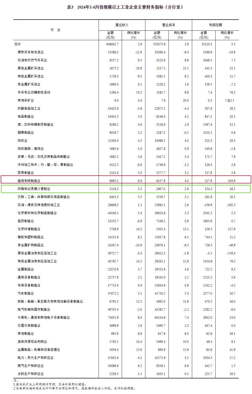 1—6月份,主要行業利潤情況如下:有色金屬冶煉和壓延加工業利潤同比增長78.2%,電力、熱力生產和供應業增長27.2%,計算機、通信和其他電子設備制造業增長24.0%,紡織業增長19.3%,農副食品加工業增長19.2%,汽車制造業增長10.7%,石油和天然氣開采業增長7.5%,通用設備制造業增長3.6%,化學原料和化學制品制造業增長2.3%,專用設備制造業下降4.2%,電氣機械和器材制造業下降8.0%,煤炭開采和洗選業下降24.8%,非金屬礦物制品業下降49.9%,石油煤炭及其他燃料加工業、黑色金屬冶煉和壓延加工業同比由盈轉虧。 值得關注的是,造紙和紙制品業實現利潤總額227.9億元,同比增長104.9%;印刷和記錄媒介復制業實現利潤總額154.2億元,同比增長16.1%。