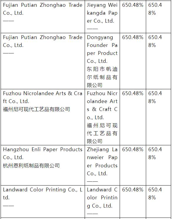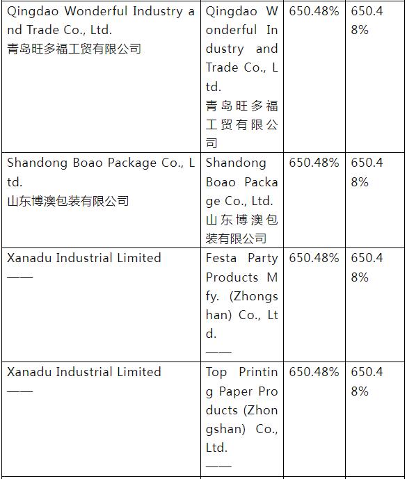 2024年8月30日,美國商務部宣布對進口自中國、泰國和越南的紙盤(Certain Paper Plates)作出反傾銷初裁,初步裁定中國生產商/出口商的傾銷率為0.00%~1039.05%(抵消補貼后的保證金調整為不適用~1039.05%,具體稅率詳見下表)、泰國生產商/出口商的傾銷率為4.23%~73.17%、越南生產商/出口商的傾銷率為0.00%~165.27%(抵消補貼后的保證金調整為0.00%~159.79%)。美國商務部預計將于2025年1月13日對本案作出反傾銷終裁。本案涉及美國海關編碼4823.69.0040項下產品。