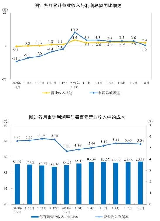 值得關(guān)注的是,造紙和紙制品業(yè)實現(xiàn)利潤總額285.4億元,同比增長86.2%;印刷和記錄媒介復(fù)制業(yè)實現(xiàn)利潤總額219.0億元,同比增長13.4%。 1—8月份,規(guī)模以上工業(yè)企業(yè)實現(xiàn)營業(yè)收入87.10萬億元,同比增長2.4%;發(fā)生營業(yè)成本74.38萬億元,增長2.6%;營業(yè)收入利潤率為5.34%,同比下降0.10個百分點。其中,造紙和紙制品業(yè)實現(xiàn)營業(yè)收入9340.3億元,同比增長5.3%;印刷和記錄媒介復(fù)制業(yè)實現(xiàn)營業(yè)收入4227.7億元,同比增長3.1%。 8月末,規(guī)模以上工業(yè)企業(yè)資產(chǎn)總計173.71萬億元,同比增長4.8%;負債合計100.11萬億元,增長4.6%;所有者權(quán)益合計73.60萬億元,增長5.2%;資產(chǎn)負債率為57.6%,同比下降0.2個百分點。 8月末,規(guī)模以上工業(yè)企業(yè)應(yīng)收賬款25.50萬億元,同比增長8.4%;產(chǎn)成品存貨6.53萬億元,增長5.1%。 1—8月份,規(guī)模以上工業(yè)企業(yè)每百元營業(yè)收入中的成本為85.39元,同比增加0.19元;每百元營業(yè)收入中的費用為8.41元,同比增加0.04元。 8月末,規(guī)模以上工業(yè)企業(yè)每百元資產(chǎn)實現(xiàn)的營業(yè)收入為76.5元,同比減少2.4元;人均營業(yè)收入為180.0萬元,同比增加7.3萬元;產(chǎn)成品存貨周轉(zhuǎn)天數(shù)為20.4天,同比增加0.3天;應(yīng)收賬款平均回收期為66.8天,同比增加3.7天。 受去年同期高基數(shù)等因素影響,8月份,規(guī)模以上工業(yè)企業(yè)利潤同比下降17.8%。 國家統(tǒng)計局工業(yè)司統(tǒng)計師于衛(wèi)寧解讀工業(yè)企業(yè)利潤數(shù)據(jù)表示,受市場有效需求不足以及高溫、暴雨、洪澇等自然災(zāi)害對部分地區(qū)沖擊較大等因素影響,加之8月份當(dāng)月同期基數(shù)較7月份明顯抬高,1—8月份,規(guī)上工業(yè)企業(yè)利潤增速有所回落,但仍延續(xù)年初以來的增長態(tài)勢,以高技術(shù)制造業(yè)為代表的新動能行業(yè)保持較快增長,工業(yè)經(jīng)濟高質(zhì)量發(fā)展持續(xù)穩(wěn)步推進。工業(yè)企業(yè)利潤和營業(yè)收入繼續(xù)保持增長、高技術(shù)制造業(yè)利潤持續(xù)快速增長、消費品制造業(yè)和裝備制造業(yè)利潤保持穩(wěn)定增長。總體看,規(guī)上工業(yè)企業(yè)利潤延續(xù)增長態(tài)勢,工業(yè)新動能支撐作用彰顯,但同時也要看到,國內(nèi)消費需求依然偏弱,外部環(huán)境復(fù)雜多變,工業(yè)企業(yè)效益恢復(fù)基礎(chǔ)仍需繼續(xù)鞏固。