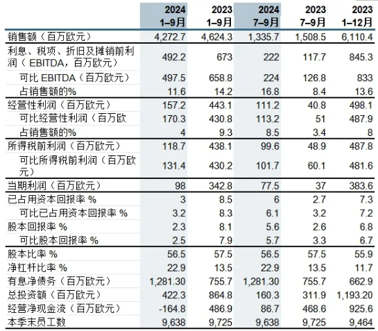 2024年1-9月(2023年1-9月同比數據) 銷售額為42.73億歐元(同比:46.24億歐元) 經營性利潤為1.57億歐元(同比:4.43億歐元);可比經營性利潤為1.7億歐元(同比:4.31億歐元) 稅前利潤為1.19億歐元(同比:4.38億歐元);可比稅前利潤為1.31億歐元(同比:4.3億歐元) 可比已占用資本回報率為3.2%(同比:8.3%) 經營性凈現金流為負1.65億歐元(同比:4.87億歐元) 2024年7-9月(2023年7-9月同比數據) 銷售額為13.36億歐元(同比15.59億歐元) 經營性利潤為1.11億歐元(同比:4100萬歐元);可比經營性利潤為1.13億歐元(同比:5100萬歐元) 稅前利潤為1.0億歐元(同比:4900萬歐元);可比稅前利潤為1.02億歐元(同比:6000萬歐元) 可比已占用資本回報率為6.1%(同比:3.2%) 經營性凈現金流為8700萬歐元(同比:4.69億歐元) 2024年第三季度主要事件 與第二季度相比,芬林集團針葉商品漿的平均銷售價格在歐洲上升了 6%,在中國下降了4%。 在歐洲,紙漿市場形勢良好。在中國,市場需求在第二季度有所減弱,但在第三季度末有所回升。 與第二季度相比,芬林集團的紙板交付量略有增加。平均價格保持穩定。 芬林集團發布了最新的綠色金融框架。之前的框架從2019年開始實施。 7月至9月的可比經營性利潤包含因凱米生物制品廠氣爆獲得的6700萬歐元保險賠償。目前正在繼續與保險聯合會進行談判,以賠償剩余的估計經濟損失。 2024年10-12月的業績預測 芬林集團2024年10-12月的可比經營性利潤預計將低于2024年7月至9月。凱米生物制品廠氣爆的保險賠償(包含在7月至9月的可比經營性利潤中)以及10月至12月期間任何的未來保險賠償均未考慮在業績指導中。2024年7月至9月,芬林集團的可比經營性利潤為1.13億歐元,其中包括6700萬歐元的保險賠償。