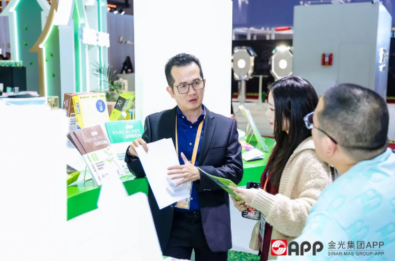 金光集團APP展臺引來觀眾駐足圍觀 除兩款升級展品外,APP王牌產品Cast Coated Arcadia 2000 & Concorde 高級涂布紙板、Golden Coin Embossed Brief Card壓紋紙、食品級防油紙、食品級紙吸管專用紙、高平滑食品級牛皮紙等在進博舞臺同樣吸引了大量興致勃勃的觀眾,加入到這段綠色旅程中來。