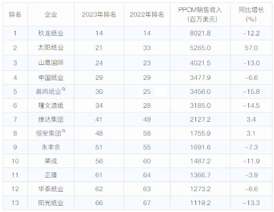 近日,Paper360雜志推出了2023全球造紙企業(yè)75強(qiáng)年度榜單,太陽(yáng)紙業(yè)以相比于2022年前進(jìn)12個(gè)名次的好成績(jī),躋身榜單前30強(qiáng),排名第21.同時(shí)紙和紙板產(chǎn)量擠進(jìn)“200萬(wàn)+集團(tuán)”名單的前十強(qiáng);近日,太陽(yáng)紙業(yè)發(fā)布公告,由李娜接替李洪信,成為太陽(yáng)紙業(yè)新一任董事長(zhǎng),這是2006年太陽(yáng)紙業(yè)上市以來(lái)首次更換董事。自此,太陽(yáng)紙業(yè)“娜”時(shí)代開(kāi)啟,而起點(diǎn)是全球紙業(yè)第21名。 2023 Top 75:13家中國(guó)紙業(yè)上榜,太陽(yáng)擠下理文成功奪回前30的“身份” 從2021年到2023年的持續(xù)三年里,全球紙業(yè)75強(qiáng)榜單中均有13家中國(guó)企業(yè)上榜。其中,玖龍紙業(yè)仍居中國(guó)企業(yè)首位,榜單中排名14.與2022年的榜單排名一致,太陽(yáng)、山鷹、中國(guó)紙業(yè)、晨鳴緊隨其后,共有5家中國(guó)紙企躋身全球紙業(yè)前30強(qiáng)。與2022年的榜單相比,2023年仍然保有5家中國(guó)企業(yè)躋身全球紙業(yè)前30強(qiáng),但從5家企業(yè)的名單看,太陽(yáng)成功擠下理文,躋身前30強(qiáng)。 從2023年上榜的13家中國(guó)企業(yè)的總體來(lái)看,與2022年大部分中國(guó)紙企排名均下降的情況不同,除了三家企業(yè)(山鷹、晨鳴、理文)排名有小幅度下降之外,其余10家企業(yè)均實(shí)現(xiàn)了排名上升或者穩(wěn)住了2022年的名次。從增幅程度來(lái)看,不得不特別提一下太陽(yáng),太陽(yáng)從2022年的33名一句上升的2023年的21名,成功奪回了其在2021年榜單中的位置,實(shí)現(xiàn)了銷(xiāo)售收入同比增長(zhǎng)57%的好成績(jī)。另外,維達(dá)和恒安也在2023年的榜單中取得了不錯(cuò)的成績(jī),實(shí)現(xiàn)了名次同比上升8個(gè)和10個(gè)的好業(yè)績(jī)。 從13家上榜的中國(guó)紙企的銷(xiāo)售收入來(lái)看,只有三家企業(yè)(太陽(yáng)、維達(dá)、恒安)實(shí)現(xiàn)了銷(xiāo)售收入的同比正增長(zhǎng),而另外的10家企業(yè)都出現(xiàn)了銷(xiāo)售收入的同比下滑,而且玖龍、山鷹、晨鳴、理文、榮成、陽(yáng)光都出現(xiàn)了兩位數(shù)的下滑,而這些企業(yè)中大多數(shù)是以包裝紙生產(chǎn)為主的企業(yè),這也足以看出目前包裝紙市場(chǎng)面臨嚴(yán)峻的挑戰(zhàn),而這或許也說(shuō)明企業(yè)從長(zhǎng)遠(yuǎn)布局產(chǎn)品結(jié)構(gòu)是可持續(xù)發(fā)展的重要保障。(見(jiàn)表1) 表1 持續(xù)三年,13家中國(guó)紙業(yè)上榜Top75