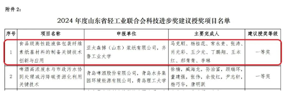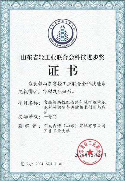 2024年12月24日,山東省輕工業(yè)聯(lián)合會(huì)公布了2024年度科學(xué)技術(shù)獎(jiǎng)獲獎(jiǎng)項(xiàng)目,公司“食品級(jí)高性能液體包裝纖維素紙基材料的制備關(guān)鍵技術(shù)創(chuàng)新與應(yīng)用”項(xiàng)目榮獲2024年度山東省輕工業(yè)聯(lián)合會(huì)科技進(jìn)步獎(jiǎng)一等獎(jiǎng)。