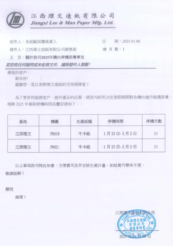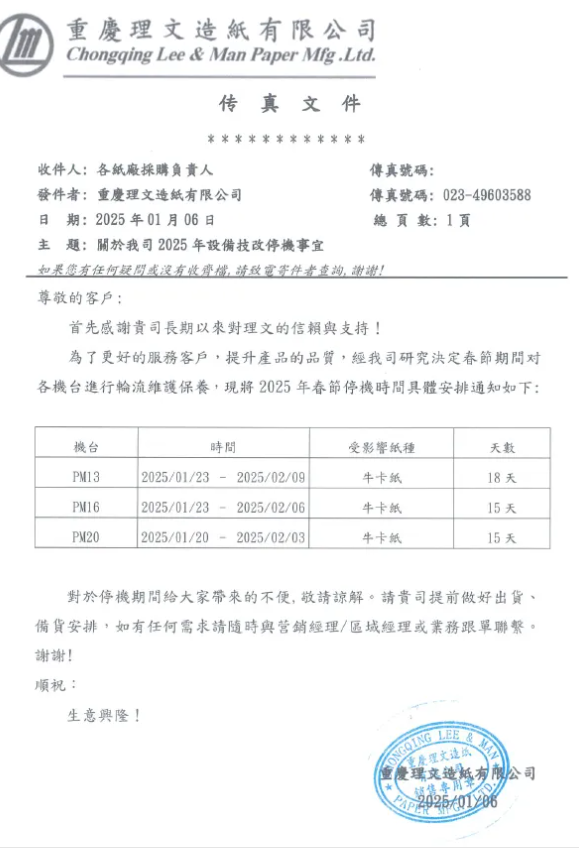 1月6日,理文造紙發布2025年春節停機計劃,國內四大基地的14臺包裝紙機將在1月中旬至2月中旬期間開展檢修,預計減產26.8萬噸包裝紙,其中包括3萬噸灰底白板紙和23.8萬噸箱板瓦楞紙。 在東莞洪梅工廠,5臺紙機計劃在1月13日至2月8日期間輪停14-25天,預計削減市場供應約11.7萬噸。該工廠還有一臺箱板紙機PM 7.未出現在停機計劃中。