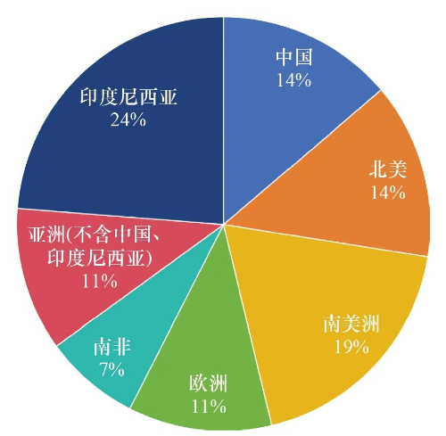 核心提示 基于2024 年全球及國內溶解漿的產能、產量、下游市場動態以及中國溶解漿進口的海關數據,結合當年產業鏈各環節發生的重大事件和關鍵時間節點,筆者對2024 年的溶解漿市場進行了全面總結。在此基礎上,進一步展望了2025 年溶解漿市場的可能發展趨勢。 關鍵詞:溶解漿;黏膠短纖維;萊賽爾;纖維素醚;進出口 2024 年,全球溶解漿產量顯著增長,總量攀升至約800 萬t,與2023 年的610 萬t 相比,增幅高達31.15%。根據2024 年全球溶解漿產量的地域分布情況(見圖1),亞洲、美洲、歐洲和非洲為主要的生產區域,共同貢獻了全球溶解漿產量的絕大部分份額。