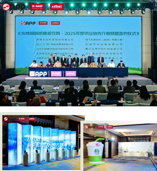 高峰圓桌論壇 此次活動的亮點(diǎn)之一是“水性阻隔紙質(zhì)餐飲具供應(yīng)鏈先行者聯(lián)盟”的簽約儀式,該聯(lián)盟的成立旨在倡導(dǎo)行業(yè)上下游各相關(guān)方共同履行環(huán)保責(zé)任,通過技術(shù)協(xié)同、資源共享、政策支持,推動行業(yè)綠色轉(zhuǎn)型。