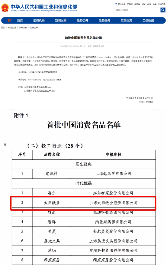 2025年2月24日,工業(yè)和信息化部消費(fèi)品工業(yè)司公示了首批中國消費(fèi)名品名單,山東太陽紙業(yè)股份有限公司憑借優(yōu)秀的產(chǎn)品質(zhì)量、創(chuàng)新能力和品牌影響力成功入選。