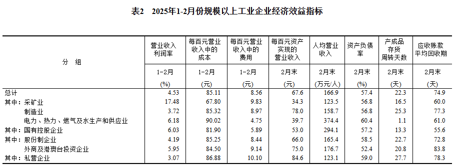 2月末,規模以上工業企業每百元資產實現的營業收入為67.6元,同比減少1.5元;人均營業收入為166.9萬元,同比增加4.3萬元;產成品存貨周轉天數為22.3天,同比增加0.2天;應收賬款平均回收期為74.9天,同比增加4.5天。