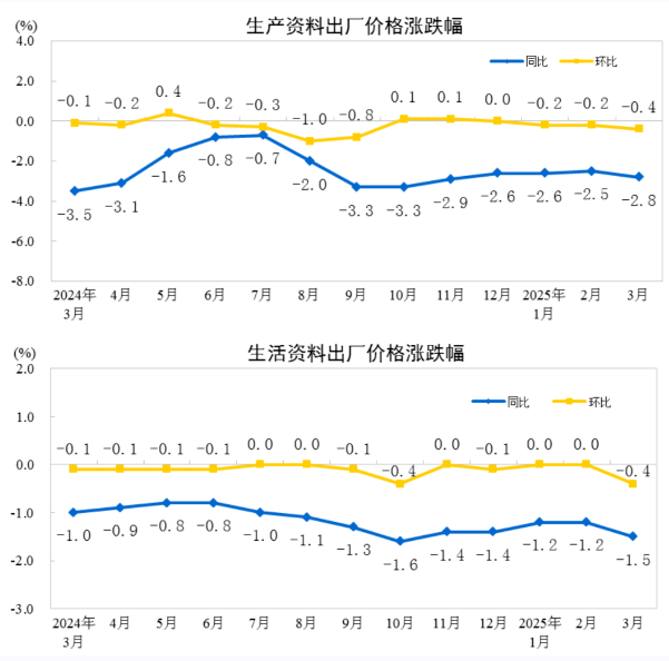 近日,國家統(tǒng)計局發(fā)布2025年3月份工業(yè)生產(chǎn)者出廠價格數(shù)據(jù)情況。2025年3月份,全國工業(yè)生產(chǎn)者出廠價格同比下降2.5%,環(huán)比下降0.4%;工業(yè)生產(chǎn)者購進(jìn)價格同比下降2.4%,環(huán)比下降0.2%。 一季度,工業(yè)生產(chǎn)者出廠價格和購進(jìn)價格比上年同期均下降2.3%。