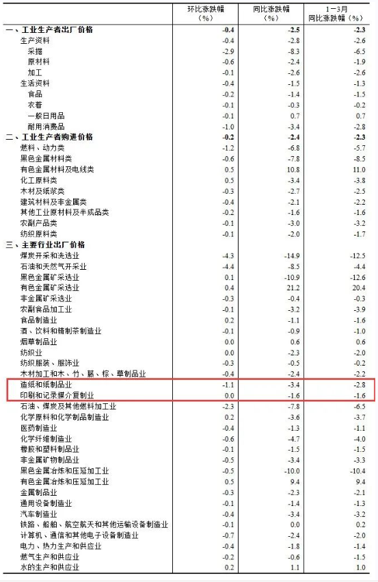 二、工業(yè)生產(chǎn)者價格環(huán)比變動情況 3月份,工業(yè)生產(chǎn)者出廠價格中,生產(chǎn)資料價格下降0.4%,影響工業(yè)生產(chǎn)者出廠價格總水平下降約0.30個百分點。生活資料價格下降0.4%,影響工業(yè)生產(chǎn)者出廠價格總水平下降約0.11個百分點。 工業(yè)生產(chǎn)者購進(jìn)價格中,燃料動力類價格下降1.2%,黑色金屬材料類價格下降0.6%,建筑材料及非金屬類價格下降0.4%,農(nóng)副產(chǎn)品類、紡織原料類價格均下降0.1%;有色金屬材料及電線類、化工原料類價格均上漲0.5%。 值得關(guān)注的是,2025年3月份印刷和記錄媒介復(fù)制業(yè)工業(yè)生產(chǎn)者出廠價格同比下降1.6%,2025年1—3月份印刷和記錄媒介復(fù)制業(yè)工業(yè)生產(chǎn)者出廠價格同比下降1.6%。 2025年3月份造紙和紙制品業(yè)工業(yè)生產(chǎn)者出廠價格同比下降3.4%,2025年1—3月份造紙和紙制品業(yè)工業(yè)生產(chǎn)者出廠價格同比下降2.8%。 2025年3月份工業(yè)生產(chǎn)者價格主要數(shù)據(jù)
