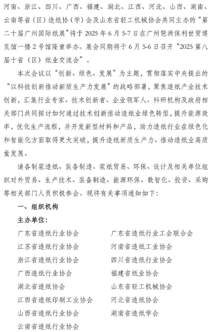 由廣東、山東、河南、浙江、四川、廣西、江西、湖北、福建、江蘇、河北、山西、云南、湖南等造紙協(學)會主辦的2025第二十屆廣州國際紙展暨生活用紙展,將于6月5日-7日,在廣州琶洲保利世貿博覽館召開。 展會得到了俄羅斯廢紙回收聯盟、印度制漿造紙協會、巴基斯坦紙商協會、緬甸制漿造紙協會、英國造紙協會的支持。 展會以品牌展示、采購對接、現場交流、專業論壇等形式,為參展企業和采購商搭建專業的商貿平臺,挖掘和拓展更多合作機會。 展會以“紙貿全球”為主題,匯聚200多家國內外品牌企業,展示紙制品行業的創新產品和技術,涵蓋制漿造紙、紙業、特種紙、造紙化學品、衛生用品、生活用紙等,為觀眾帶來更多選擇和靈感。