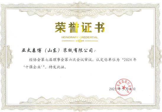 5月8日-9日,以“創新驅動、綠色發展”為主題的“2025山東省造紙行業年會暨山東省造紙產業綠色低碳高質量發展大會”在德州成功召開。會上,中國造紙協會副理事長、山東省造紙行業協會專職副會長趙振東宣讀了《山東協會認定“雙十”標桿企業——山東省造紙行業協會“2024年‘十強企業’‘十佳企業’”通報》,其中,亞太森博(山東)漿紙有限公司被認定為“2024年‘十強企業’”。
