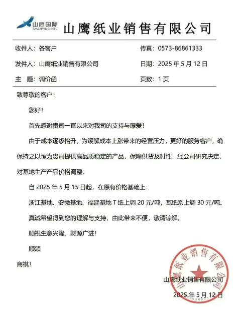 由于成本逐級抬升,為緩解成本上漲帶來的經營壓力,為更好服務客戶,確保持之以恒為客戶提供高品質穩定的產品,保障供貨及時性,山鷹紙業銷售有限公司于5月12日發布調價函,宣布自2025年5月15日起,在原有價格基礎上:浙江基地、安徽基地、福建基地T紙上調20元/噸,瓦紙系上調30元/噸。