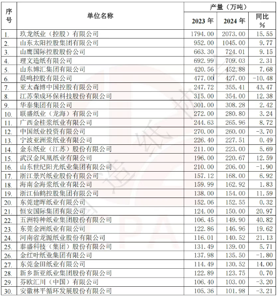 △2024年紙及紙板產(chǎn)量100萬噸以上的省(區(qū)、市) 在《中國造紙工業(yè)2024年度報告》中,國內(nèi)重點造紙產(chǎn)量前30強企業(yè)出爐。其中,玖龍紙業(yè)以超過2000萬噸的產(chǎn)量遙遙領(lǐng)先,太陽紙業(yè)的年產(chǎn)量也突破了1000萬噸,山鷹國際、理文造紙的年產(chǎn)量超過700萬噸,其余26家紙企年產(chǎn)量在100萬噸-460萬噸之間。 值得一提的是,金光集團APP旗下山東博匯集團、廣西金桂漿紙業(yè)、寧波亞洲漿紙業(yè)、江蘇金東紙業(yè)、海南金海漿紙業(yè)、金紅葉紙業(yè)6家企業(yè)入圍,總產(chǎn)量逼近1500萬噸。若以此數(shù)據(jù)計算,金光集團APP在中國的產(chǎn)能僅次于玖龍紙業(yè)。