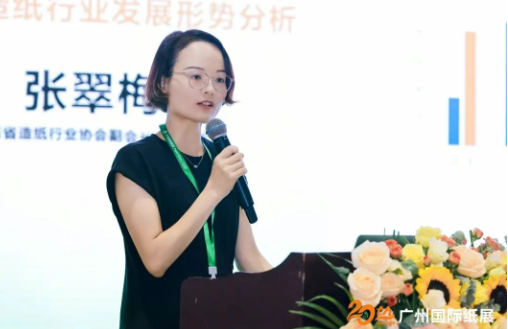 湖南省造紙學(xué)會理事長周文春 廣東省造紙行業(yè)協(xié)會副會長兼秘書長張翠梅、華南理工大學(xué)先進(jìn)造紙與紙基材料全國重點(diǎn)實(shí)驗(yàn)室教授/主任王小慧、中糧期貨有限公司高級經(jīng)理郭義豪、廣東新巨能能源科技有限公司總經(jīng)理馬博、上海元哲信息咨詢有限公司合伙人/董事總經(jīng)理戴元峰、浙江中控技術(shù)股份有限公司造紙事業(yè)部解決方案專家/副總工呂定云、合肥維天運(yùn)通信息科技股份有限公司(路歌)營銷總經(jīng)理李德偉圍繞紙業(yè)發(fā)展趨勢、綠色轉(zhuǎn)型及數(shù)字化、智能化等主題進(jìn)行分享。 廣東省造紙行業(yè)協(xié)會副會長兼秘書長張翠梅作《廣東省造紙行業(yè)發(fā)展概況》主題演講。 張翠梅副會長以造紙行業(yè)運(yùn)行情況為切入點(diǎn),解讀了2024年廣東省造紙行業(yè)發(fā)展?fàn)顩r及相關(guān)政策,并圍繞行業(yè)存在的原料受限、進(jìn)口原紙沖擊和同質(zhì)化競爭問題,提出了“優(yōu)化原料結(jié)構(gòu)”,“加強(qiáng)創(chuàng)新”和“AI賦能行業(yè)發(fā)展”的建議。 2024 年廣東省紙及紙板產(chǎn)量達(dá) 2648.33 萬噸,同比增長 8.1%,占全國總產(chǎn)量 16.7%,居全國第二位;產(chǎn)量結(jié)構(gòu)以包裝紙為主,占79%,文化用紙和生活用紙分別占11%、5%;行業(yè)集中度進(jìn)一步提高,有8 家企業(yè)產(chǎn)能超 100 萬噸以上;主要經(jīng)濟(jì)指標(biāo)運(yùn)行良好,營業(yè)收入、營業(yè)成本、利潤同比均有所回升。