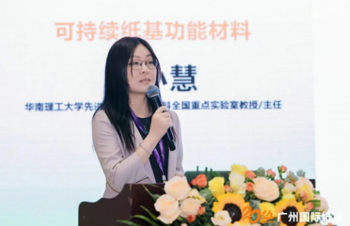 廣東省造紙行業(yè)協(xié)會副會長兼秘書長張翠梅 華南理工大學(xué)先進(jìn)造紙與紙基材料全國重點(diǎn)實(shí)驗(yàn)室教授/主任王小慧,分享《可持續(xù)紙基功能材料》主題演講。 王小慧教授指出造紙工業(yè)是當(dāng)前最具規(guī)模效益的生物質(zhì)產(chǎn)業(yè), 漿紙材料作為典型生物基材料具有不可替代性。中國作為全球第一造紙大國,仍面臨高品質(zhì)纖維原料、高端造紙成套裝備、關(guān)鍵組件和工業(yè)軟件主要依賴進(jìn)口等挑戰(zhàn),產(chǎn)業(yè)轉(zhuǎn)型迫在眉睫。 王小慧教授所在的實(shí)驗(yàn)室在紙基材料領(lǐng)域取得多項(xiàng)突破,目前的研發(fā)目標(biāo)是開展生物質(zhì)涂層化學(xué)品的原始創(chuàng)新研究,形成自主技術(shù),以及開發(fā)可商業(yè)化的紙基材料替代產(chǎn)品。