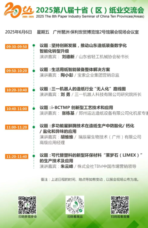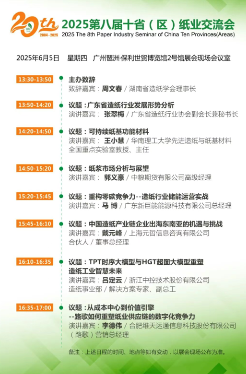 合肥維天運(yùn)通信息科技股份有限公司(路歌)營銷總經(jīng)理李德偉 從技術(shù)追趕到標(biāo)準(zhǔn)輸出,從產(chǎn)能提升到價值鏈主導(dǎo),廣州國際紙展的二十年,正是中國造紙業(yè)攀登全球產(chǎn)業(yè)金字塔尖的縮影。二十載櫛風(fēng)沐雨,二十載春華秋實(shí)。從珠江之濱出發(fā),廣州國際紙展已成長為全球造紙產(chǎn)業(yè)版圖上的重要坐標(biāo),見證并推動了中國從造紙大國向造紙強(qiáng)國的歷史性跨越。當(dāng)“紙貿(mào)全球”從愿景變?yōu)槿粘#@座珠江畔的展館,已然成為定義紙業(yè)未來的策源地。 紙載文明,智創(chuàng)未來,在這三天,這里書寫的每一筆交易、每一次握手、每一項(xiàng)創(chuàng)新,都將在全球紙業(yè)演進(jìn)史上留下鮮明的“中國印記”。 在這個書寫了二十年輝煌的平臺上,中國造紙業(yè)將與世界攜手,以綠色為底,以創(chuàng)新為筆,繪就更加波瀾壯闊的嶄新篇章! 以下是2025第八屆十省(區(qū))紙業(yè)交流會日程、展位圖和參展商名錄: