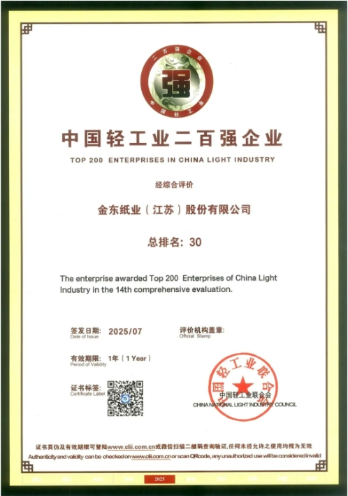 金東紙業(yè)(江蘇)股份有限公司以科技創(chuàng)新和綠色制造的新質(zhì)生產(chǎn)力推動(dòng)企業(yè)轉(zhuǎn)型升級(jí)獲得了中國(guó)輕工業(yè)聯(lián)合會(huì)的認(rèn)可,榮膺“2024年度中國(guó)輕工業(yè)二百?gòu)?qiáng)企業(yè)”(位列第30名)、“中國(guó)輕工業(yè)造紙行業(yè)十強(qiáng)企業(yè)”(位列第5名)兩項(xiàng)殊榮。這是該榜單自2011年開始發(fā)布以來,金東連續(xù)十四年入選。