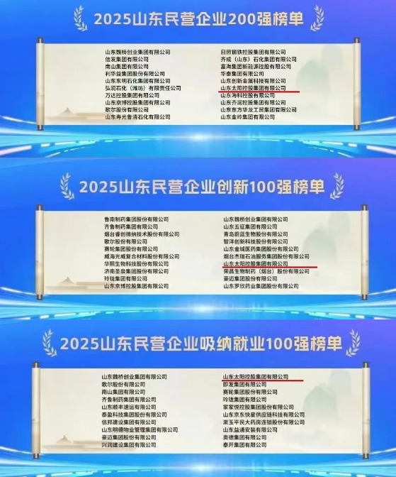 8月19日,2025山東民營企業百強系列榜單發布會暨第二屆臨商大會開幕式在臨沂市舉行。會議發布了2025山東民營企業200強、2025山東民營企業創新100強、2025山東民營企業吸納就業100強等榜單,公司控股股東山東太陽控股集團有限公司排名穩步提升,位列2025山東民營企業200強第16位,2025山東民營企業創新100強第17位,2025山東民營企業吸納就業100強第11位。