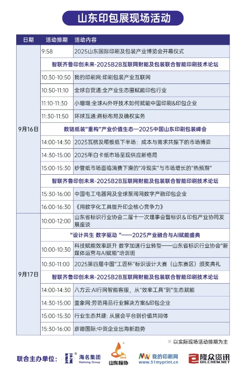 箱匯齊魯,印創未來!9月16日,2025海名·山東印刷及包裝產業博覽會(以下簡稱“山東印包展”)在山東國際會展中心2號館隆重開幕。本屆匯聚參展企業200+家,展示新產品新技術1000余個,展覽面積10000+平方米。覆蓋印刷包裝完整的上下游產業鏈,涵蓋印刷設備、瓦楞紙箱機械、標識標簽、智能包裝機械、包裝制品及材料、圖文印務等全新題材。