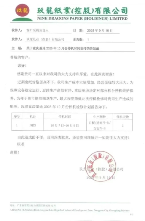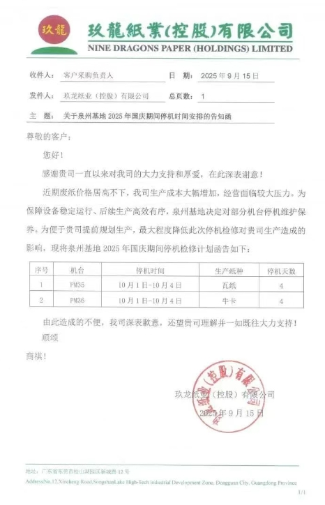 造紙廠最新調價通知 • 玖龍紙業太倉基地 1、自九月二十二日起,太倉基地海龍優質牛卡價格上調50元/噸,地龍優質牛卡價格上調30元/噸。 2、自九月二十六日起,太倉基地瓦楞紙價格上調30元/噸。 • 玖龍紙業泉州基地 自九月二十二日起,泉州基地所有牛卡、瓦楞紙價格上調RMB30元/噸。 • 玖龍紙業重慶基地 自九月二十二日起,重慶基地再生牛卡價格上調50元/噸。 • 山鷹紙業 自9月17日起,在原有價格基礎上: 廣東基地:紅杉、T紙上調50元/噸,瓦紙上調30 元/噸; 自9月20日起,在原有價格基礎上: 浙江、安徽基地:紅杉、T紙、瓦紙上調30元/噸; 自9月22日起,在原有價格基礎上: 福建基地:紅杉系、瓦紙系上調30元/噸; 浙江、安徽基地:紫杉、金杉上調30元/噸。 • 榮成環保 于9月26日起,針對我司T紙/瓦紙上調30元/噸。 造紙廠停機計劃 • 玖龍紙業湖北基地
