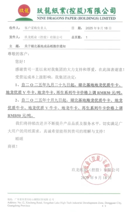 玖龍九大基地最新調(diào)價(jià)通知 • 玖龍湖北基地 1、自九月二十九日起,湖北基地地龍優(yōu)質(zhì)牛卡、地龍優(yōu)質(zhì)V牛卡、地龍牛卡、再生系列牛卡價(jià)格上調(diào)RMB 30 元/噸。 2、自十月九日起,湖北基地海龍優(yōu)質(zhì)牛卡、地龍優(yōu)質(zhì)牛卡、地龍優(yōu)質(zhì)V牛卡、地龍牛卡、再生系列牛卡價(jià)格上調(diào)RMB 50 元/噸。