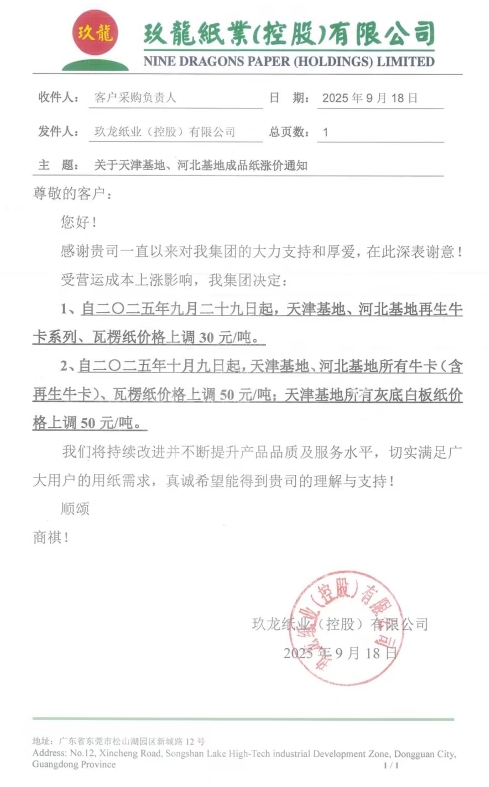 • 玖龍?zhí)旖颉⒑颖被?/strong> 1、自九月二十九日起,天津基地、河北基地再生牛卡系列、瓦楞紙價(jià)格上調(diào) 30 元/噸。 2、自十月九日起,天津基地、河北基地所有牛卡(含再生牛卡)、瓦楞紙價(jià)格上調(diào) 50 元/噸;天津基地所有灰底白板紙價(jià)格上調(diào) 50 元/噸。