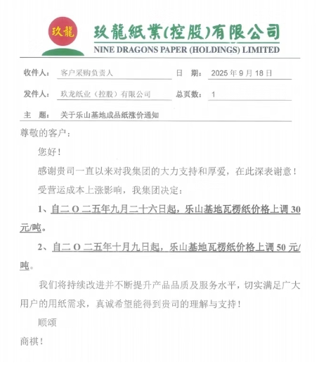 • 玖龍樂山基地 1、自九月二十六日起,樂山基地瓦楞紙價(jià)格上調(diào) 30 元/噸。 2、自十月九日起,樂山基地瓦楞紙價(jià)格上調(diào) 50 元/噸。