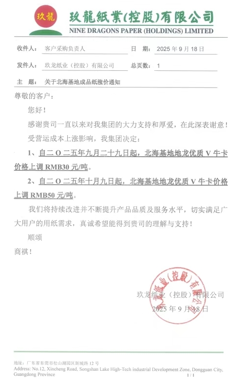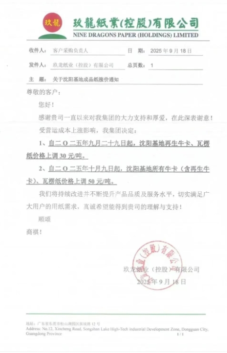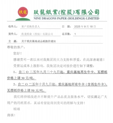 • 玖龍重慶基地 1、自九月二十九日起,重慶基地再生牛卡、瓦楞紙價(jià)格上調(diào) 30 元/噸。 2、自十月九日起,重慶基地所有牛卡(含再生牛卡)、瓦楞紙價(jià)格上調(diào) 50 元/噸。