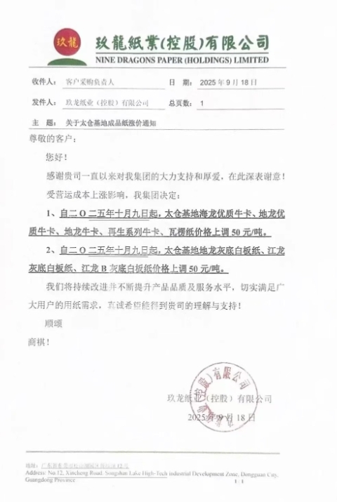 • 玖龍?zhí)珎}基地 1、自十月九日起,太倉基地海龍優(yōu)質(zhì)牛卡、地龍優(yōu)質(zhì)牛卡、地龍牛卡、再生系列牛卡、瓦楞紙價(jià)格上調(diào) 50 元/噸。 2、自十月九日起,太倉基地地龍灰底白板紙、江龍灰底白板紙、江龍B灰底白板紙價(jià)格上調(diào) 50 元/噸。