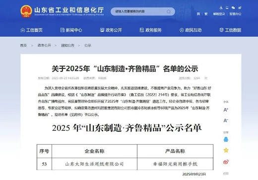 近日,山東省工業和信息化廳公示了2025年“山東制造·齊魯精品”名單,其中,公司幸福陽光商用擦手紙憑借突出的產品質量和品牌優勢成功入選。
