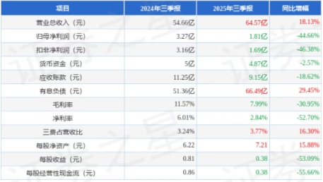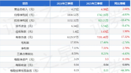 凱恩股份(002012) 公司營業總收入4.38億元,同比上升2.66%,歸母凈利潤1742.18萬元,同比下降4.83%。