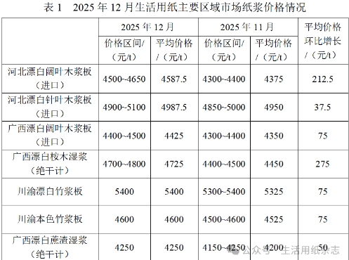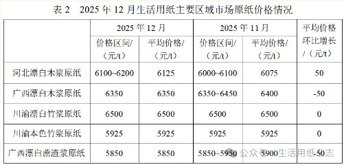 據《生活用紙》雜志調研數據,2025年12月生活用紙主要區域市場紙漿平均價格均有上漲,其中廣西漂白桉木濕漿(絕干計)、河北漂白闊葉木漿板(進口)平均價格漲幅較大,均超過200元/t,其他區域市場紙漿平均價格漲幅較小。