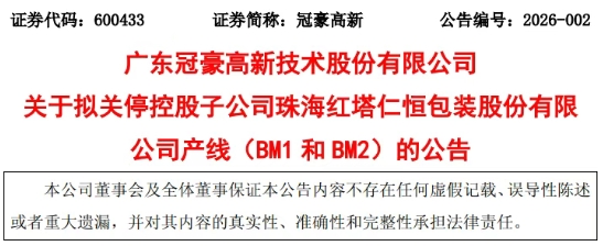 預計虧損1.55億元-3.1億元 2026年1月23日晚間,冠豪高新發布業績預告。經公司財務部門初步測算,預計2025年1月1日至12月31日,實現歸屬于母公司所有者的凈利潤為-3.10億元到-1.55億元,與上年同期的1.84億元相比,將出現虧損。 公開資料顯示,冠豪高新是一家大型造紙企業,旗下擁有多家子公司,主營業務為特種紙(熱敏紙、熱升華轉印紙、高檔涂布白卡紙等)及特種材料(不干膠標簽、醫療膠片涂料、數碼印刷膜、造紙化工品等)的研發、生產制造和銷售。 在業績預告中,冠豪高新方面表示,本期公司業績出現較大幅度下滑,主要受行業內卷、子公司部分產線關停計提減值準備、投資收益同比減少等綜合因素影響: 行業競爭加劇與價格下滑:報告期內,公司所處行業環境發生顯著變化。一方面,行業內新增產能集中投放,市場供給增加;另一方面,下游市場需求呈現階段性疲軟態勢。在供需關系變化的背景下,市場競爭日趨激烈,導致公司主要產成品的銷售價格面臨下行壓力。盡管公司持續推進降本增效,但產品售價的下降仍對整體毛利率產生了較大幅度的不利影響。 投資收益同比減少:2024年度,公司處置華新(佛山)彩色印刷有限公司股權取得1.55億元投資收益,該收益屬于一次性非經常性損益。本報告期公司無類似股權處置事項,導致非經常性收益較上年同期大幅下降,利潤基數同比相應減少。 政府補助減少:因補貼政策調整,報告期內公司政府補助金額較上年同期減少,計入其他收益的補助規模下降,對本期利潤形成一定影響。 更為重要的是,為優化公司資源配置和生產基地布局、降低運營成本、減少虧損,冠豪高新擬關停珠海紅塔仁恒包裝股份有限公司位于廣東省珠海市香洲區的前山廠生產線。基于審慎的會計原則,公司計提資產減值金額預計為1.67億元到2.51億元,將減少歸母凈利潤約0.94 億元到1.40億元。