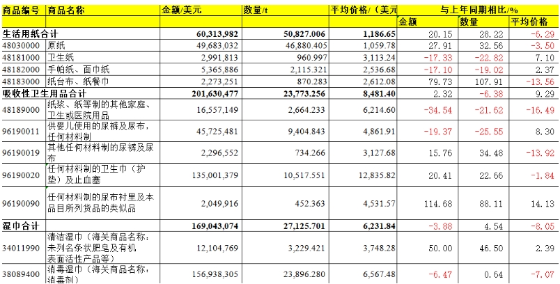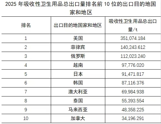 出口的生活用紙仍以成品紙(衛(wèi)生紙、手帕紙、面巾紙、餐巾紙等)為主,占生活用紙總出口量的68.53%。其中,衛(wèi)生紙占總出口量的26.37%,占比呈逐年下降趨勢(2024年為29.18%,2023年為30.12%),手帕紙、面巾紙的占比為33.38%(2024年為31.17%),在成品紙出口品類中占比最大,紙臺布、餐巾紙的占比為8.78%,比2024年略有下降。 進(jìn)口: 2025年,生活用紙全年總進(jìn)口量僅為5.08萬t,進(jìn)口的生活用紙以原紙為主,占比為92.24%! 吸收性衛(wèi)生用品 中國吸收性衛(wèi)生用品出口量多年來保持平穩(wěn)增長,進(jìn)口量則不斷下滑。2025年,吸收性衛(wèi)生用品的總出口量已遠(yuǎn)高于總進(jìn)口量,國產(chǎn)的產(chǎn)品能夠滿足國內(nèi)市場需求,中國一次性衛(wèi)生用品在國際市場的影響力和競爭力不斷增強(qiáng)。 出口: 2025年吸收性衛(wèi)生用品的總出口量達(dá)175.52萬t,比2024年增長10.43%,出口金額達(dá)44.79億美元,比2024年增長5.23%。女性衛(wèi)生用品、嬰兒紙尿褲、成人失禁用品的出口量均有不同程度的增長。嬰兒紙尿褲在吸收性衛(wèi)生用品出口量中占比最大,為43.66%。