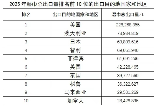 進(jìn)口: 吸收性衛(wèi)生用品總進(jìn)口量自2017年的25.5萬t逐年遞減,2025年總進(jìn)口量僅2.38萬t。近年來,國內(nèi)吸收性衛(wèi)生用品產(chǎn)能增長、品質(zhì)提升,消費(fèi)者對進(jìn)口產(chǎn)品的需求下降。其中,嬰兒紙尿褲的進(jìn)口量比2024年下降25.55%,在各類吸收性衛(wèi)生用品中降幅最大,衛(wèi)生巾產(chǎn)品進(jìn)口量則比2024年增長,已成為進(jìn)口吸收性衛(wèi)生用品中占比最大的品類。 濕巾 2025年,中國濕巾出口量比2024年增長,進(jìn)口量雖微增,但總量較少,濕巾出口量遠(yuǎn)高于進(jìn)口量。 出口: 2025年,濕巾的總出口量為100.90萬t,比2024年增長20.91%。出口產(chǎn)品以清潔濕巾為主,出口量占比為83.73%。(注:目前,在海關(guān)的商品編碼中將清潔濕巾歸入34011990.消毒濕巾歸入38089400.但是這兩個編碼下不只是濕巾產(chǎn)品,還包括其他清潔、消毒產(chǎn)品。)