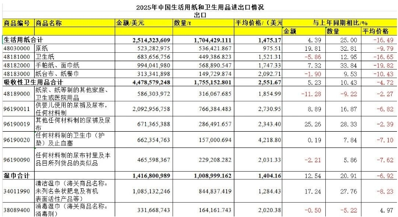 生活用紙 根據(jù)海關(guān)統(tǒng)計數(shù)據(jù),2025年,中國生活用紙出口量連續(xù)4年增長,進(jìn)口量雖也有增長,但總量相對較少。中國生活用紙市場以出口為主,國內(nèi)生活用紙產(chǎn)量和產(chǎn)品種類已經(jīng)能夠滿足本地市場需求,進(jìn)口產(chǎn)品對國內(nèi)市場影響微小。 出口: 2025年,生活用紙總出口量達(dá)到170.44萬t,比2024年增長25.00%;出口金額為25.14億美元,比2024年增長4.39%;出口平均價格比2024年下降16.49%,出口呈現(xiàn)量增價減的趨勢。