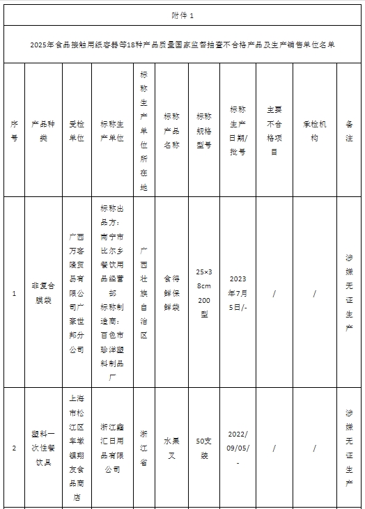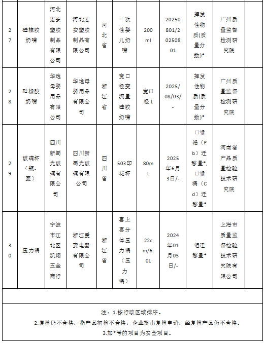 2025年,市場(chǎng)監(jiān)管總局組織開(kāi)展食品接觸用紙容器等18種食品相關(guān)產(chǎn)品質(zhì)量國(guó)家監(jiān)督抽查。現(xiàn)將抽查情況通報(bào)如下: 一、基本情況 (一)監(jiān)督抽查概況。本次共抽查18種產(chǎn)品1133批次,在上海、廣東、浙江等25個(gè)省份472家銷(xiāo)售單位抽查616批次產(chǎn)品,在廣東、浙江、山東等27個(gè)省份505家生產(chǎn)單位抽查517批次產(chǎn)品。抽查共發(fā)現(xiàn)30批次不合格產(chǎn)品,其中:違法違規(guī)產(chǎn)品4批次;檢驗(yàn)不合格產(chǎn)品26批次,包括食品接觸用紙容器9批次、保鮮膜6批次、餐具洗滌劑4批次、非復(fù)合膜袋3批次、硅橡膠奶嘴2批次、玻璃杯(瓶、壺)和壓力鍋各1批次(見(jiàn)附件1)。 (二)跟蹤抽查情況。跟蹤抽查到上次抽查不合格生產(chǎn)單位25家,其中有1家生產(chǎn)單位產(chǎn)品仍不合格(見(jiàn)附件2)。 (三)拒檢情況。本次抽查中,廣東省佛山市瑪諾駿電器科技有限公司違反《中華人民共和國(guó)產(chǎn)品質(zhì)量法》規(guī)定,無(wú)正當(dāng)理由拒絕接受監(jiān)督抽查(見(jiàn)附件3)。 二、抽查結(jié)果 (一)食品接觸用紙容器。共抽查116批次產(chǎn)品,重點(diǎn)對(duì)感官要求、重金屬(以Pb計(jì))、鉛(Pb)、砷(As)、熒光性物質(zhì)、甲醛、1.3-二氯-2-丙醇、3-氯-1.2-丙二醇、總遷移量、高錳酸鉀消耗量、芳香族伯胺遷移總量、大腸菌群、沙門(mén)氏菌、霉菌、感官指標(biāo)、滲漏性能、抗壓強(qiáng)度、耐溫試驗(yàn)、耐溫性能、抗壓性能、杯身挺度、端蓋脫離力、軸向壓潰力、快速泄漏試驗(yàn)等24個(gè)項(xiàng)目進(jìn)行檢驗(yàn)。其中在廣東、浙江、江蘇等18個(gè)省份的46家生產(chǎn)單位抽查46批次產(chǎn)品,發(fā)現(xiàn)1批次產(chǎn)品安全項(xiàng)目熒光性物質(zhì)不合格,2批次產(chǎn)品感官指標(biāo)不合格,2批次產(chǎn)品抗壓強(qiáng)度不合格;在上海、浙江、廣東等17個(gè)省份的58家銷(xiāo)售單位抽查70批次產(chǎn)品,發(fā)現(xiàn)感官指標(biāo)、抗壓性能、抗壓強(qiáng)度、杯身挺度各有1批次產(chǎn)品不合格。 (二)保鮮膜。共抽查33批次產(chǎn)品,重點(diǎn)對(duì)感官要求、總遷移量、高錳酸鉀消耗量、重金屬(以Pb計(jì))、芳香族伯胺遷移總量、脫色試驗(yàn)、阻隔性能(氧氣)、阻隔性能(水蒸氣)等8個(gè)項(xiàng)目進(jìn)行檢驗(yàn)。其中在江蘇、安徽2個(gè)省份的2家生產(chǎn)單位抽查2批次產(chǎn)品,未發(fā)現(xiàn)不合格產(chǎn)品;在廣東、浙江、河北等8個(gè)省份的23家銷(xiāo)售單位抽查31批次產(chǎn)品,發(fā)現(xiàn)5批次產(chǎn)品阻隔性能(氧氣)不合格、3批次阻隔性能(水蒸氣)不合格。 (三)餐具洗滌劑。共抽查105批次產(chǎn)品,重點(diǎn)對(duì)總砷(以As計(jì))、重金屬(以Pb計(jì))、甲醇、甲醛、1.4-二噁烷、菌落總數(shù)、大腸菌群、總有效物含量、pH、總五氧化二磷含量、農(nóng)藥去除效果(P值)、總堿的質(zhì)量分?jǐn)?shù)(以NaOH計(jì))等12個(gè)項(xiàng)目進(jìn)行檢驗(yàn)。其中在廣東、遼寧、上海等24個(gè)省份的53家生產(chǎn)單位抽查53批次產(chǎn)品,發(fā)現(xiàn)1批次產(chǎn)品總有效物含量不合格;在廣東、福建、四川等16個(gè)省份的44家銷(xiāo)售單位抽查52批次產(chǎn)品,發(fā)現(xiàn)2批次產(chǎn)品安全項(xiàng)目菌落總數(shù)不合格,1批次產(chǎn)品總有效物含量不合格。 (四)非復(fù)合膜袋。共抽查109批次產(chǎn)品,重點(diǎn)對(duì)感官要求、總遷移量、高錳酸鉀消耗量、重金屬(以Pb計(jì))、芳香族伯胺遷移總量、特定遷移總量(以對(duì)苯二甲酸計(jì))、特定遷移總量(以1.2-乙二醇計(jì))、阻隔性能(氧氣)、阻隔性能(水蒸氣)、熱封強(qiáng)度等10個(gè)項(xiàng)目進(jìn)行檢驗(yàn)。其中在安徽、山東、上海等11個(gè)省份的43家生產(chǎn)單位抽查43批次產(chǎn)品,發(fā)現(xiàn)3批次產(chǎn)品阻隔性能(氧氣)不合格;在上海、山東、河北等11個(gè)省份的57家銷(xiāo)售單位抽查66批次產(chǎn)品,發(fā)現(xiàn)1批次產(chǎn)品涉嫌無(wú)證生產(chǎn),已交由屬地市場(chǎng)監(jiān)管部門(mén)處理。 (五)硅橡膠奶嘴。共抽查30批次產(chǎn)品,重點(diǎn)對(duì)感官要求、總遷移量、高錳酸鉀消耗量、重金屬(以Pb計(jì))、鋅(Zn)遷移量、N-亞硝胺和N-亞硝胺可生成物釋放量、揮發(fā)性物質(zhì)等7個(gè)項(xiàng)目進(jìn)行檢驗(yàn)。其中在廣東、浙江、河北等5個(gè)省份的18家生產(chǎn)單位抽查18批次產(chǎn)品,發(fā)現(xiàn)2批次產(chǎn)品安全項(xiàng)目揮發(fā)性物質(zhì)不合格;在廣東、北京、河北等5個(gè)省份的12家銷(xiāo)售單位抽查12批次產(chǎn)品,未發(fā)現(xiàn)不合格產(chǎn)品。 (六)玻璃杯(瓶、壺)。共抽查42批次產(chǎn)品,重點(diǎn)對(duì)感官要求、鉛(Pb)遷移量、鎘(Cd)遷移量、口緣鉛(Pb)遷移量、口緣鎘(Cd)遷移量、砷(As)遷移量、銻(Sb)遷移量、耐水性(玻璃顆粒耐水性、內(nèi)表面耐水性能)、內(nèi)應(yīng)力(雙折射光程差)等9個(gè)項(xiàng)目進(jìn)行檢驗(yàn)。其中在重慶、河北、安徽等10個(gè)省份的16家生產(chǎn)單位抽查16批次產(chǎn)品,發(fā)現(xiàn)1批次產(chǎn)品安全項(xiàng)目口緣鉛(Pb)遷移量、口緣鎘(Cd)遷移量不合格;在浙江、安徽、山東等11個(gè)省份的23家銷(