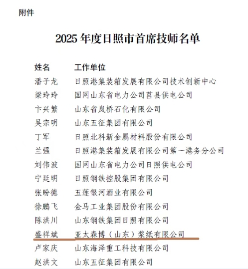 近日,日照市委組織部、市人社局、市財政局聯合公布了2025年度日照市首席技師名單,亞太森博(山東)漿紙有限公司公共維修部盛祥斌入選,同時他也成為公司繼郭同安、夏兆江、宋琛年、單來亭、呂愛民、劉升之后的第7位日照市首席技師。