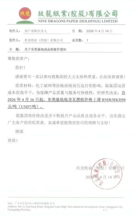 自2026年4月16日起,東莞基地地龍瓦楞紙價格上調RMB/HKD 50元/噸(USD7/噸)。
