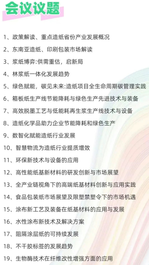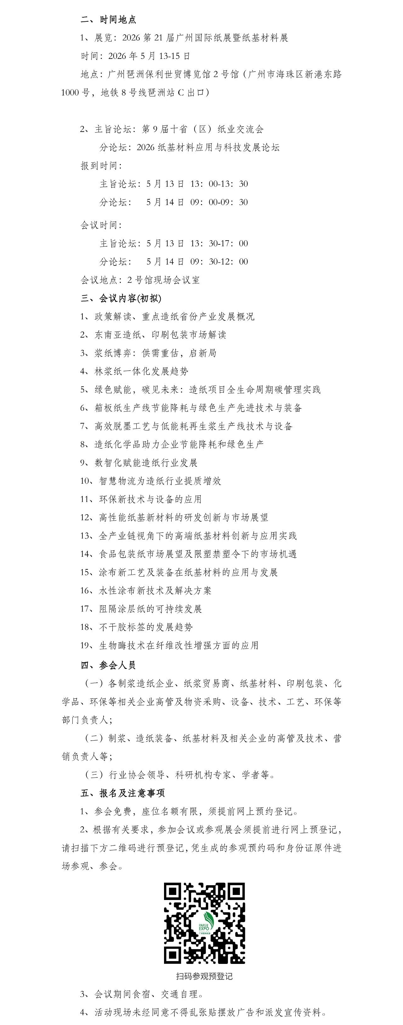 展會(huì)同期舉辦2026 第九屆十省(區(qū))紙業(yè)交流會(huì)與2026 紙基材料應(yīng)用與科技發(fā)展論壇,圍繞政策導(dǎo)向、全球市場(chǎng)、漿紙格局、綠色低碳、智能制造、新材料創(chuàng)新六大核心議題,匯聚行業(yè)權(quán)威專家與領(lǐng)軍企業(yè)展開深度研討。 論壇立足國(guó)內(nèi)重點(diǎn)造紙省份產(chǎn)業(yè)政策與發(fā)展態(tài)勢(shì),前瞻東南亞造紙及印刷包裝市場(chǎng)潛力;解析全球漿紙供需新格局,探索林漿紙一體化可持續(xù)發(fā)展路徑。聚焦全生命周期碳管理、節(jié)能降耗、再生漿高效利用、綠色化學(xué)品及環(huán)保新技術(shù),分享低碳生產(chǎn)實(shí)踐與先進(jìn)裝備應(yīng)用;以數(shù)智化升級(jí)、智慧物流賦能產(chǎn)業(yè)提質(zhì)增效,推動(dòng)行業(yè)高質(zhì)量轉(zhuǎn)型。 同時(shí),論壇圍繞高性能紙基新材料、高端紙基材料創(chuàng)新應(yīng)用展開交流,解讀食品包裝紙及 “限塑禁塑” 政策帶來(lái)的市場(chǎng)機(jī)遇,分享涂布新工藝、水性涂布、阻隔涂層技術(shù)及不干膠標(biāo)簽發(fā)展趨勢(shì),探討生物酶技術(shù)在纖維改性增強(qiáng)領(lǐng)域的前沿應(yīng)用,為造紙、涂布、包裝、新材料全產(chǎn)業(yè)鏈提供技術(shù)指引與解決方案。